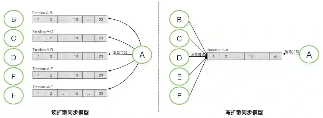 消息同步模型会比消息存储模型稍复杂一些,消息的同步一般有读扩散(也叫拉模式)和写扩散(也叫推模式)两种不同的方式,分别对应不同的 Timeline 物理模型。