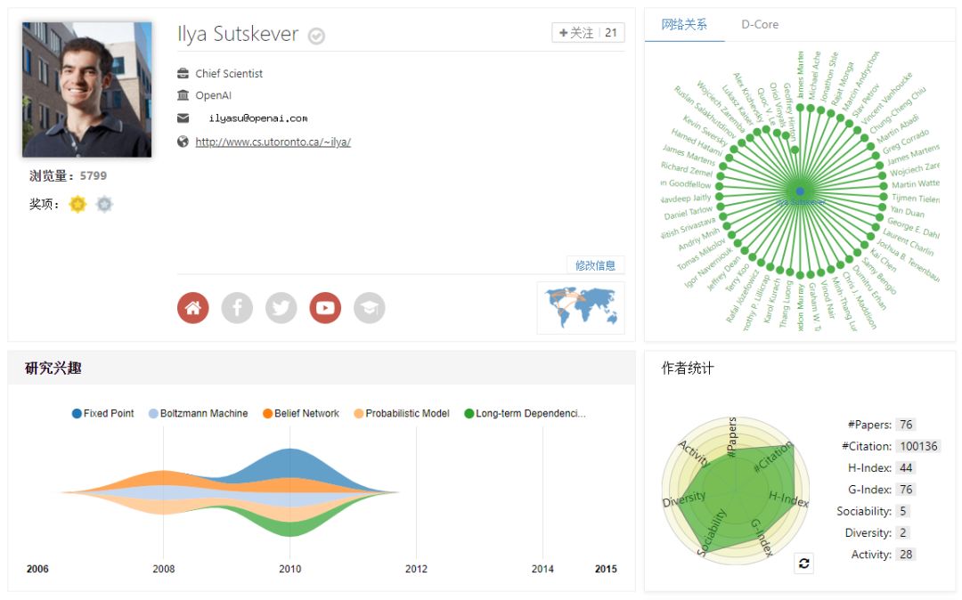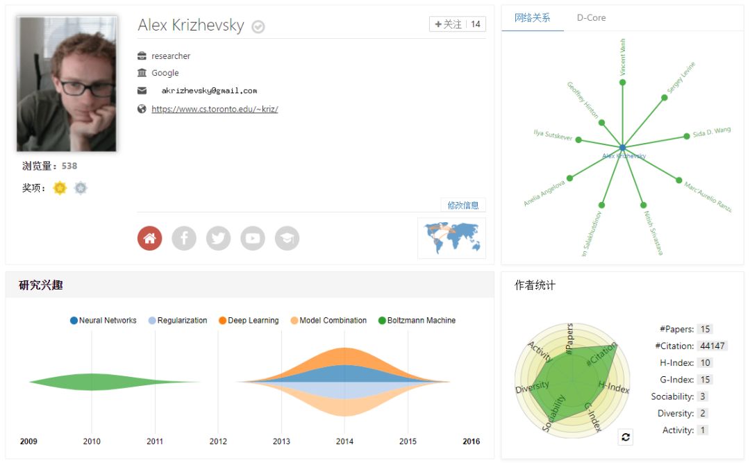 排在榜单第三位的Alex Krizhevsky,同样作为Hinton的博士生,Alex似乎显得更为低调,网上也鲜有他的资料。