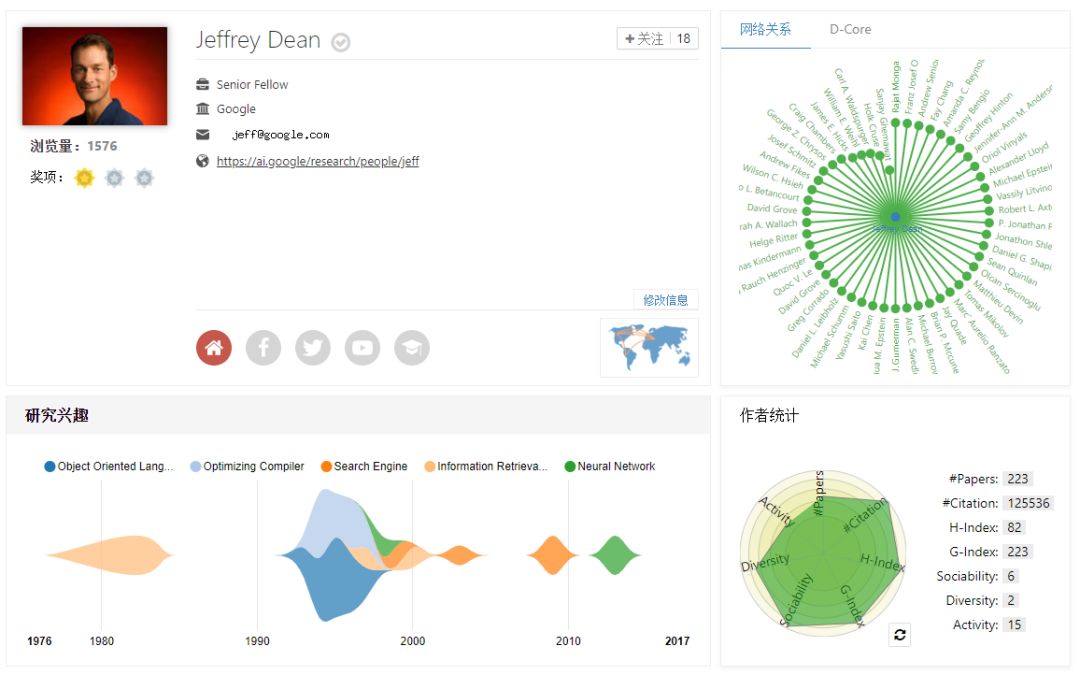 谷歌人工智能大神Jeff Dean,是谷歌的首席架构师、谷歌研究院的高级研究员,也是谷歌的人工智能团队谷歌大脑(Google Brain)的负责人。身披华盛顿大学博士、美国工程院院士、ACM Fellow、清华大学AI研究院计算机学科顾问、AAAS Fellow等名誉的Jeff Dean在谷歌负责过许多大型项目,支持谷歌运行的超大规模计算框架MapReduce和机器学习的标志性软件TensorFlow就是在他的领导下开发的。