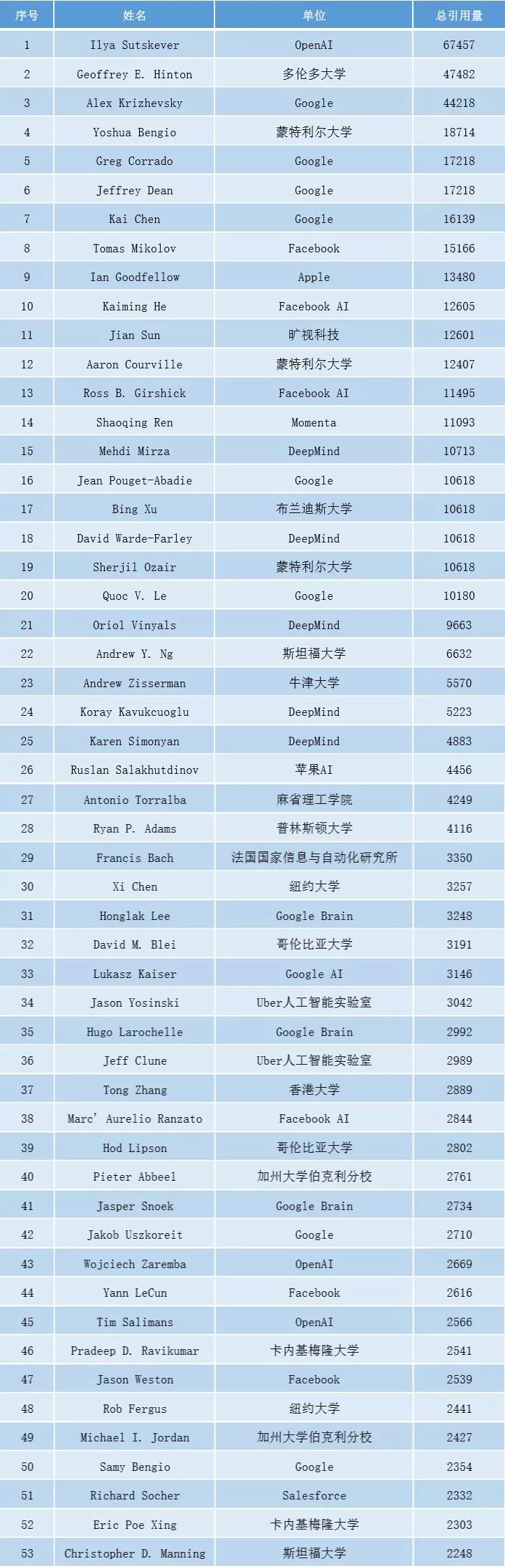 正可谓青出于蓝而胜于蓝, 排在榜首的Ilya Sutskever不仅是Hinton的博士生,还是吴恩达的博后,他曾是谷歌的顶级人工智能专家,后来创办了人工智能非盈利公司——OpenAI。