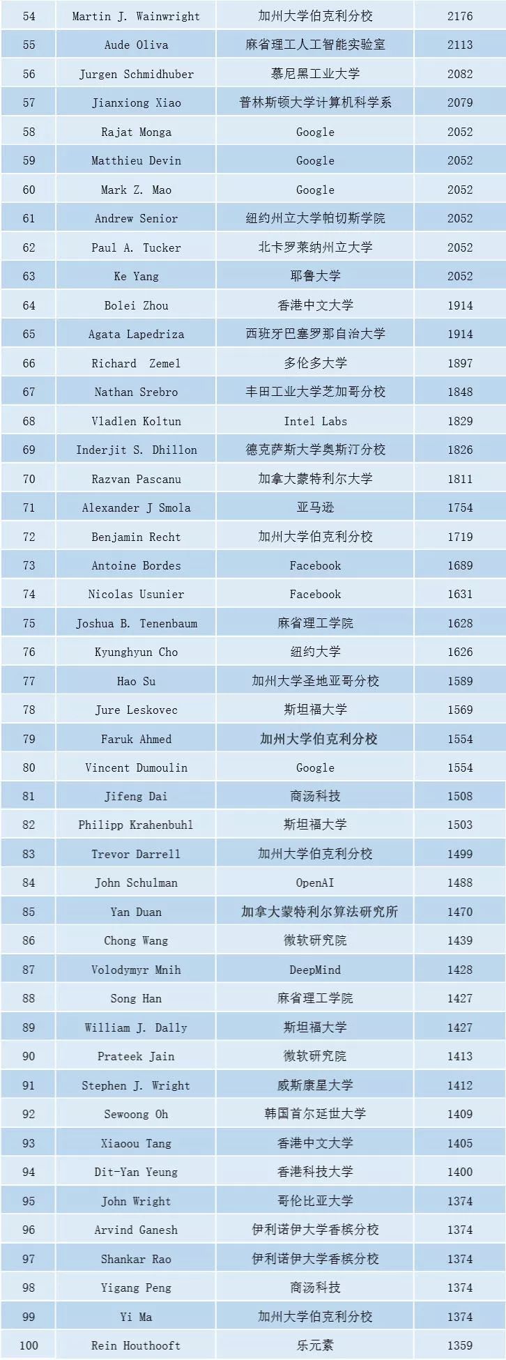 在这100位学者中,谷歌+DeepMind就占据了五分之一,形成了绝对的霸主地位,8人来自Facebook,7人来自加州大学伯克利分校。同时,斯坦福大学5人,麻省理工学院4人,OpenAI 4人,纽约大学、蒙特利尔大学都有3人上榜。