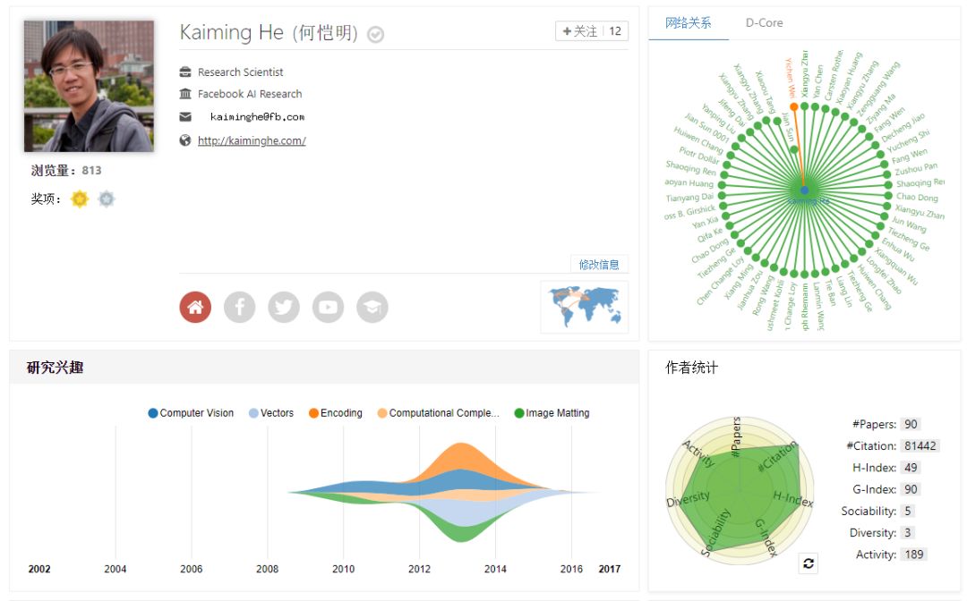 排在第十位的是计算机视觉大神、Facebook AI研究科学家何恺明。他的研究方向为计算机视觉和深度学习。十年间他在NeurIPS共发表过3篇论文,总引用量为12605次。