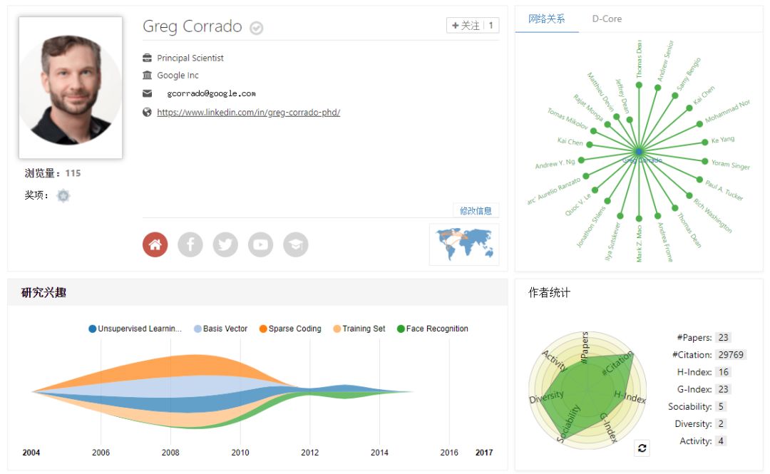 位于高引学者榜单第五至第八位的学者,是来自谷歌的Greg Corrado、Jeffrey Dean、Kai Chen、Tomas Mikolov。