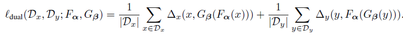 考虑建立在两个空间X和Y之间的对偶任务,我们最终的目标是学习两个智能体,学习原始任务的f_0: X→Y,和学习对偶任务的g_0:Y→X。传统的对偶学习优化损失函数: