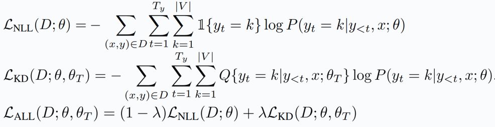 其中L_NLL(D; θ)代表在真实训练集上的对数似然损失函数,L_KD(D; θ, θ_T )代表知识蒸馏的损失函数,最终的损失函数L_ALL(D; θ, θ_T )是两者的加权平均。D代表训练数据集,θ代表学生模型的参数,θ _T代表老师模型的参数,T_y代表目标句子的长度,|V|代表目标语词表大小,Q代表老师模型的概率分布。