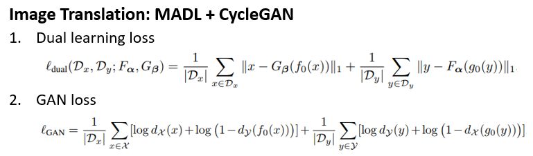 在图像翻译中,我们将MADL于CycleGAN结合,优化目标函数如下: