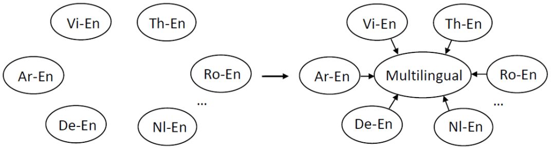 多语言翻译模型(一个模型同时翻译多个语言对),由于能减少离线训练多个模型的代价,以及减少线上服务消耗,正受到越来越多的关注。当多语言模型同时处理几十、上百种语言对时,翻译精度通常低于单语言翻译模型(一个模型只翻译一个语言对)。基于这个现象,我们提出通过知识蒸馏的方法将性能较优的单语言翻译模型的知识转移到多语言模型中来,以提升多语言翻译模型的精度。