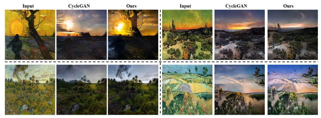 我们在照片和油画(梵高,塞尚,莫奈,浮世绘)的互相翻译,街景和标签互译两个任务上进行试验,都获得更好的翻译质量。