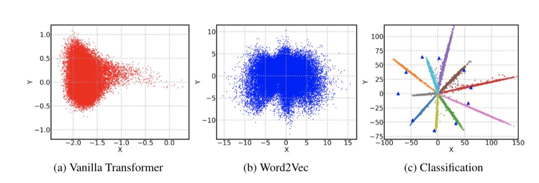 这种现象与其他分类任务有很大不同,并且会显著降低模型的表达能力。从softmax输出层的角度看,这些参数需要有多样化的分布,才能达到更大的分类间距(margin);从嵌入词向量的角度,这些参数应该有足够的能力来刻画自然语言中巨大的语义变化。然而,根据我们的实验观测,虽然模型的复杂性(例如模型参数维度)提供了足够的表达能力,实际学习到的模型却只有有限的表达能力。