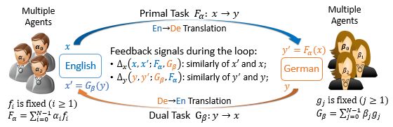 在这种双智能体的系统中,两个智能体f和g需要进行互相评价。具体而言,反向智能体g需要评价由正向智能体f生成的y ̂ =f(x),并为正向智能体提供反馈信号Δ_x (x,g(y ̂ )),反之亦然。在这个过程中,智能体的评价质量对引导学习过程而言非常重要。我们在现有对偶学习框架的基础上,引入多智能体共同作用于学习系统。同一个任务方向的不同智能体之间,有相似的模型容量和良好的多样性,它们的共同作用可以为学习过程提供更加可靠和鲁棒的反馈信号,从而帮助系统获得更好的性能。