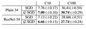 最后,本文在图像分类任务上验证了G-SGD算法的有效性。实验选用的模型为深层卷积神经网络PlainNet-34和深层残差神经网络ResNet-34,数据集为CIFAR-10和CIFAR-100。下表展示了G-SGD算法和SGD算法的测试误差。结果表明,G-SGD算法相较于SGD算法可以到达更低的测试误差,体现了在G-空间优化的好处。