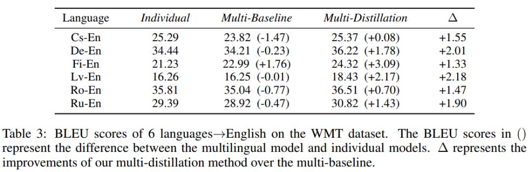 我们在IWSLT/WMT/TED Talks三个多语言翻译数据集上验证方法的效果。下表是在WMT数据集上的结果,传统的多语言的基线方法(Multi-Baseline)相比单语言模型(Individual)有一定程度的性能损失,而我们的方法(Multi-Distillation)相比单语言模型都有性能提升,比多语言的基线方法有1-2个BLEU分的提升,显示出我们方法的有效性。更多数据集的实验结果以及关于方法的分析,请查阅论文。