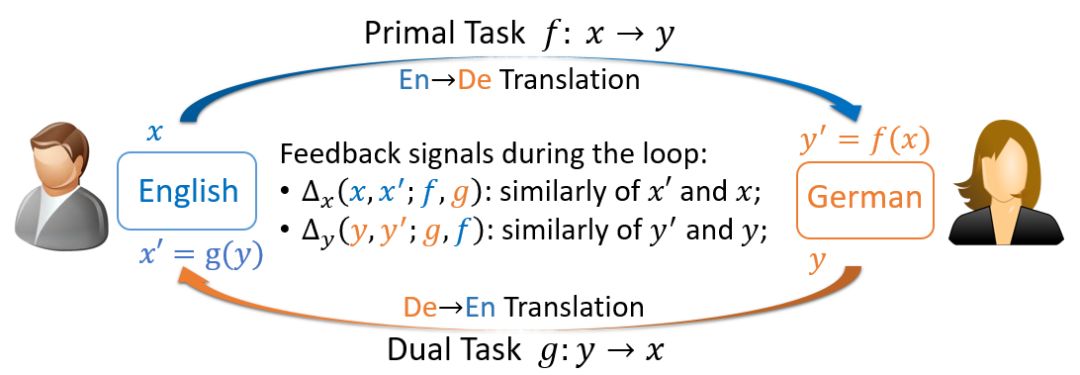 对偶学习的基本思想,是利用任务的对称属性 (primal-dual),从两个对称的任务空间中获得有效的反馈/正则化,从而加强学习过程。传统对偶学习可以理解为两个智能体(agent)的博弈:一个智能体学习原始任务(prima task)f: X→Y,另一个智能体学习对偶任务(dual task)g:Y→X。在对偶学习中,我们首先将x∈X通过第一个智能体f映射为 y ̂ =f(x)∈Y,然后再利用第二个智能体g重构为x ̂ =g(y ̂ )∈X。x和x ̂ 之间的失真度Δ_x (x,x ̂ )作为反馈信号,协助引导和加强学习过程。
