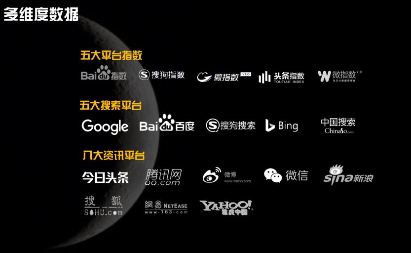 其中,搜索数据来自Google、百度、搜狗、必应和中国搜索这5大搜索平台,新闻数据则来自今日头条、腾讯网、微博、微信、新浪网、搜狐、网易和雅虎这8大资讯平台。
