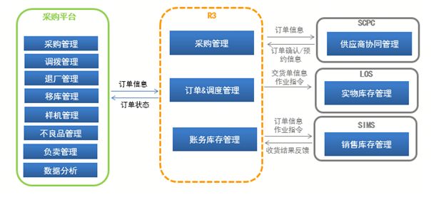 如上图所示使用 R3 管理采购业务、订单调度、账务库存,对现有系统架构、库存结构、库存核算没有改动,风险相对可控,投入资源相对较少,虽然离去除 R3 的目标只算迈出一小步,但对于保障业务的稳定性是值得的!