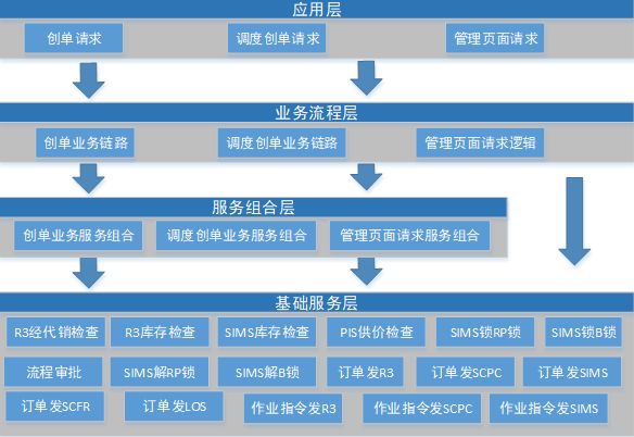将一些基础服务,简单而言就是将创单逻辑分解成基础服务,新的功能基于基础服务进行积木式组合,如下图:
