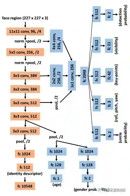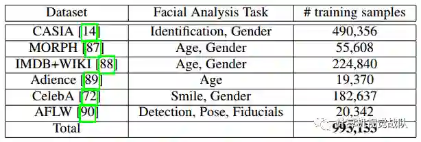 All-in-One Face网络架构使用预训练验证网络Sankararanayanan[25],包含七个卷积层,之后是三个全连接层。该网络被用作人脸部进行训练的主干识别任务。来自前6个卷积的参数此网络的层在其他面相关中共享任务如下图所示。针对人脸识别任务的CNN预训练提供了对通用人脸分析任务的更好的初始化,因为过滤器保留了区别人脸信息。