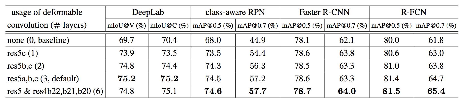 Table 1 在各种方法和各种数据集上,使用不同层数的可变形卷积对结果带来的影响,其中 DeepLab 在 VOC2012 与 Cityscapes 的训练集上进行训练,在验证集上进行测试,class-aware RPN, Faster R-CNN 与 R-FCN 在 VOC2007 与 VOC2012 的训练验证集上进行训练,在 VOC2007 的测试集上进行测试。
