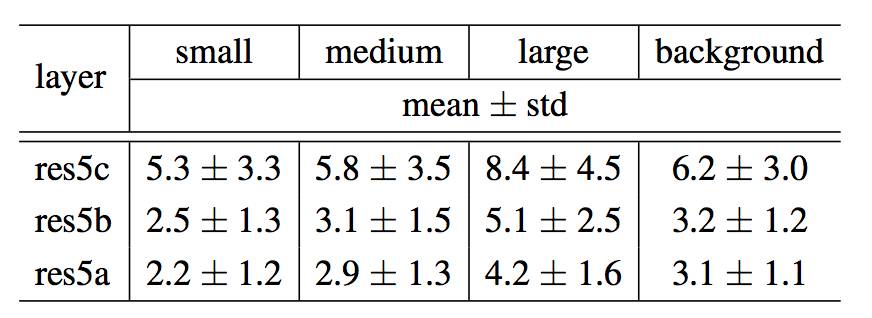 Table 2 在使用可变形卷积与可变形兴趣区域池化以后,class-aware RPN,Faster RCNN,R-FCN 在 COCO 数据集上的结果,训练使用 trainval 数据集,测试使用 test-dev 数据集,其中 M 表示多尺度训练,B 表示迭代边界框平均。