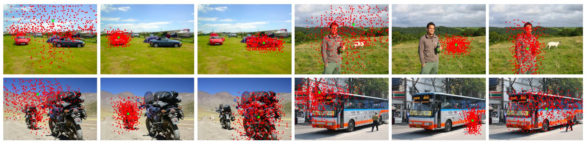 Figure 5 对可变形卷积的效果进行了可视化,其中左中右分别展示了激活单元(绿点)倒推三层可变形卷积层以后在背景/小物体/大物体上的所采样的点