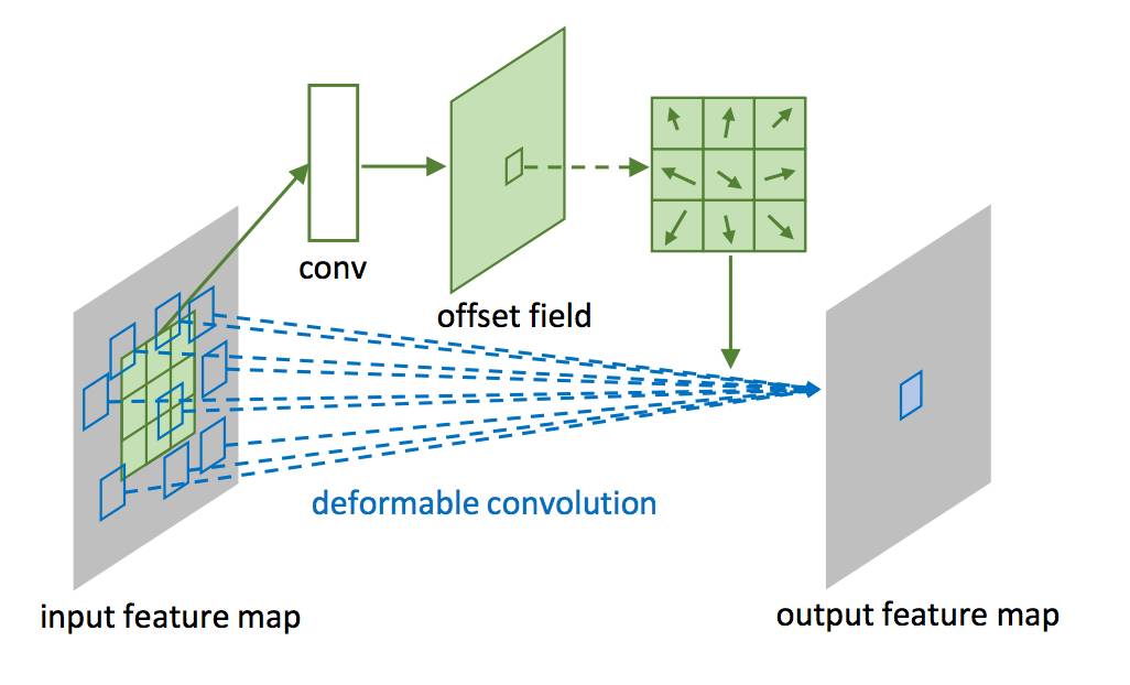 Figure 2 展示了可变形卷积框架,首先通过一个小卷积层(绿色)的输出得到可变形卷积所需要的位移量,然后将其作用在卷积核(蓝色)上,达到可变形卷积的效果。