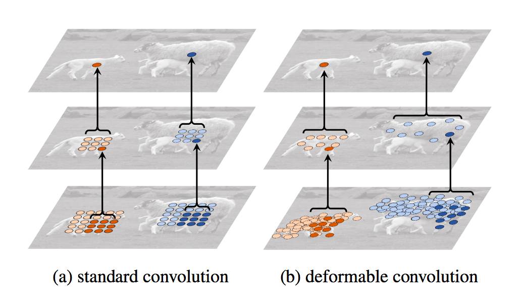 由于构造卷积神经网络 (CNN) 所用的模块中几何结构是固定的,其几何变换建模的能力本质上是有限的。在我们的工作中,我们引入了两种新的模块来提高卷积神经网络 (CNN) 对变换的建模能力,即可变形卷积 (deformable convolution) 和可变形兴趣区域池化 (deformable ROI pooling)。它们都是基于在模块中对空间采样的位置信息作进一步位移调整的想法,该位移可在目标任务中学习得到,并不需要额外的监督信号。新的模块可以很方便在现有的卷积神经网络 (CNN) 中取代它们的一般版本,并能很容易进行标准反向传播端到端的训练,从而得到可变形卷积网络 (deformable convolutional network)。大量的实验验证了我们的方法在目标检测和语义分割这些复杂视觉任务上的有效性。代码将会公布。