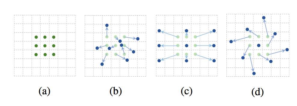 Figure 1 展示了卷积核大小为 3x3 的正常卷积和可变形卷积的采样方式,(a) 所示的正常卷积规律的采样 9 个点(绿点),(b)(c)(d) 为可变形卷积,在正常的采样坐标上加上一个位移量(蓝色箭头),其中 (c)(d) 作为 (b) 的特殊情况,展示了可变形卷积可以作为尺度变换,比例变换和旋转变换的特殊情况