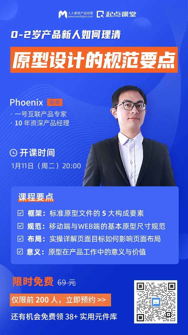 为了帮助0-2岁产品新人更快地掌握规范、专业的原型设计,在产品的道路上少走弯路,1月11日(周二)20点,人人都是产品经理&起点课堂特邀业内 10 年资深产品经理@Phoenix 老师,准备了这次直播公开课。