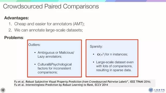 对于这类数据,我们一般是要做Crowdsourced Paired Comparisons来收集它的标注信息,这里的优势在于,标注起来更节省成本,可以标注大规模的数据集。这里有个问题,一个是outliers,另一个是sparsity,因为毕竟是一个稀疏空间。