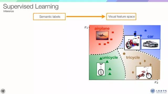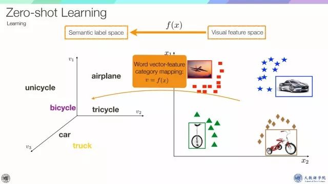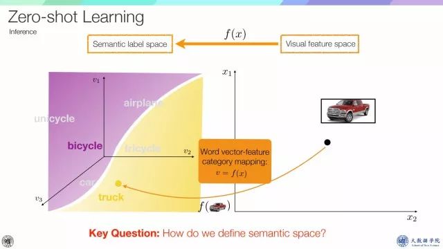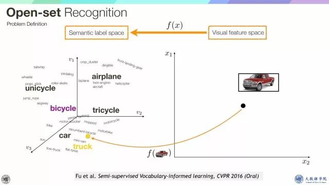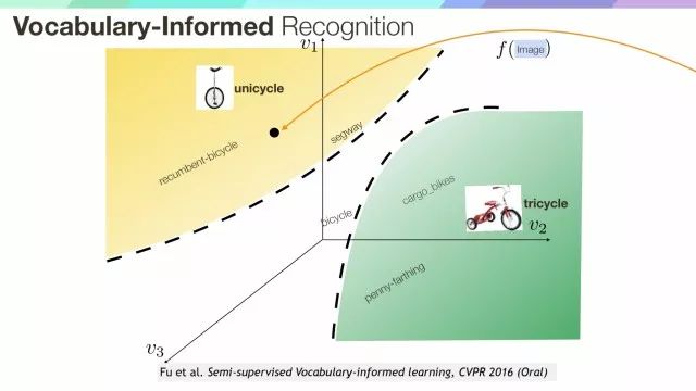 另一方面我们可以利用free-vovabulary词汇来帮助整个学习过程,比如图像被映射到语义空间,在这个空间中,只知道unicycle或tricycle,在零样本学习情况下,我们更倾向于把它归为unicycle,因为它靠近unicycle的语义原型。