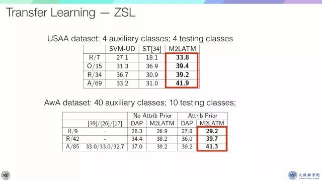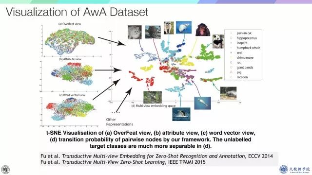 在三个标准测试集上的结果显示效果非常好,尤其是AwA,这是2014年的结果,AwA的结果已经能达到80.5。