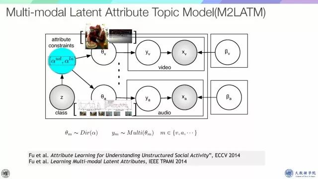 基本的模型结构如图所示,通过multi-modal latent attribute topic model来建模视频、音频等模态数据之间的关系,这里的属性可以是用户自定义的,也可以是潜在的属性,我们可以在attribute claim 中加以限定,通过topic挖掘对应的信息。