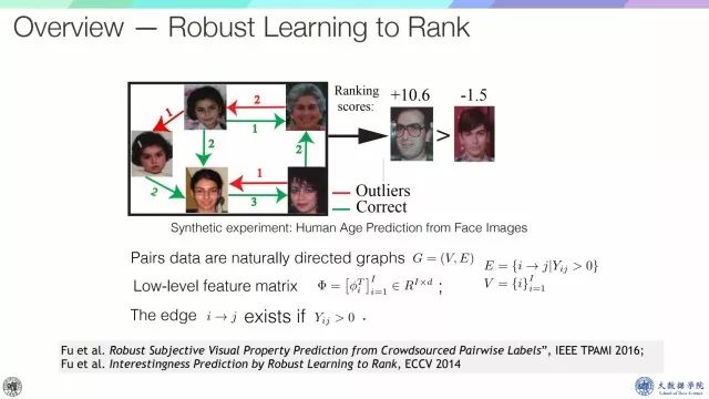 我们提出了一个robust learning to rank框架来解决上述两个问题,这里图像是一些合成样本,左边是若干人脸,比较他们的年龄,我们收集了一些temporation,绿色是predict,红色是outline,根据得到的信息预测ranking。