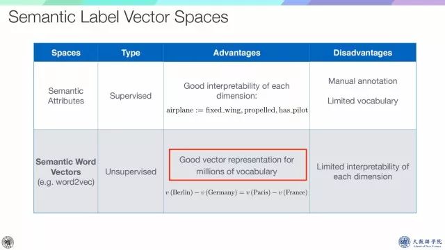如图所示,一般的语义标签大体上可以分为两类,一类是Semantic Attributes(语义属性),它具有很好的解释性但需要大量的人工标注,而另一类是Semantic Word Vectors(语义向量),可以从大量文本中训练出来,并不需要人工标注,并有大量的free vocabulary。