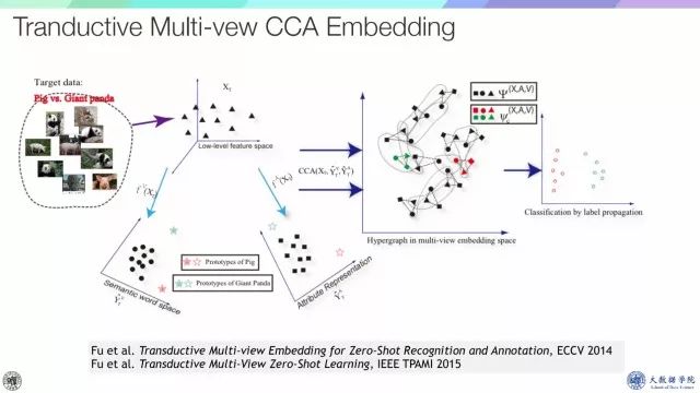 基于这三个问题,我们提出了一个算法框架。假设在目标数据上可以得到不同的子空间,每一个空间代表每一个view,利用一个multi-view CCA把数据投影到CCA space,在这个空间里面构造一个graph或者hyper graph,然后进行ranking,这样就可以做one-shot learning,zero-shot learning,甚至open set learning。