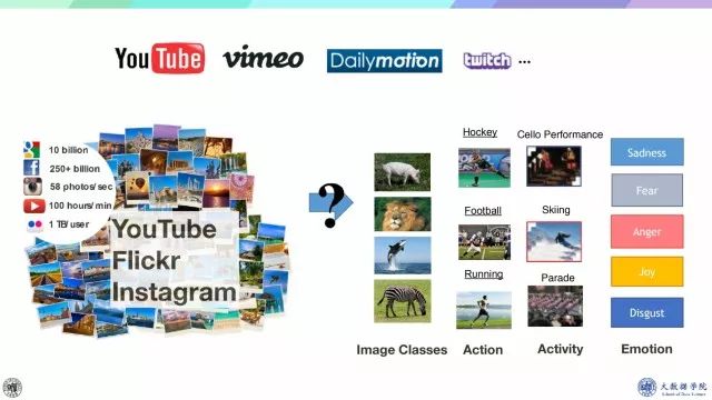 视频理解,通过深度学习来embedding 目标或者场景,做action,activity,one-shot learning,zero-shot learning。上图为video emotion understanding的工作。
