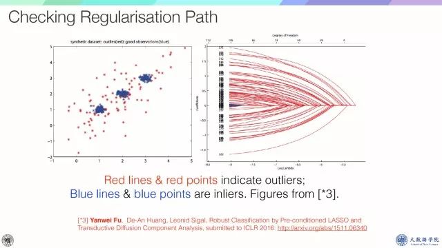 我们的解法是用Regularisation Path,左边蓝色点对应inline,红色点对应outline,如果check regularisation path会发现,从右到左变换拉姆达值的时候,outline会首先出现,所以就可以对所有这些点进行排序,然后top就是outline。