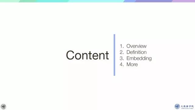 我今天介绍的内容可以概括为四个单词:Overview,Definition,Embedding,More.