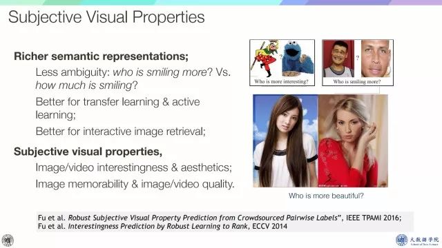 关系类型的数据标注,可以统称为Subjective visual properties。比如比较两幅图像哪一个更漂亮,哪一个更有意思,哪一个笑得更多一些,这是更好的语义表示,它的歧义性更小,更有利于迁移学习。我们定义subjective visual properties,类似的问题包括image/video interestingness & aesthetics,以及image memorability & image/video quality等。
