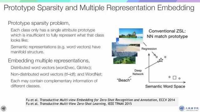 第二个问题是prototype sparsity问题,也就是每一个新类其实只有一个attribute prototype,那么就需要考虑是否能利用数据本身的信息,比如manifold information,第三个是embedding multiple representations,我们现在已有semantic attribute,semantic word vector,考虑把它们嵌到一起。