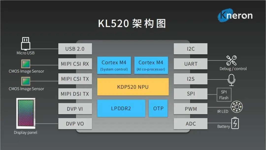 KL520 包括了两个 ARM Cortex M4 核心, KDP520 NPU 加速器,以及 DDR 存储器,提供 USB,DVP 等 I/O 接口。