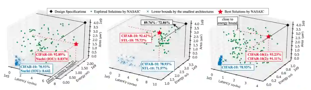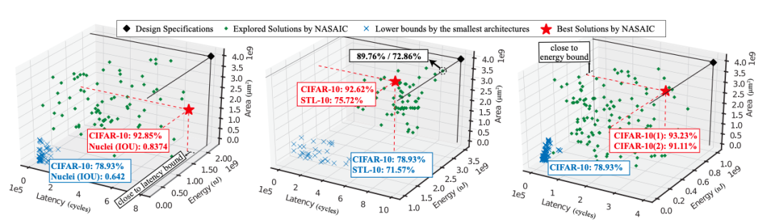 针对三种不同的工作负载,ASICNAS 在三种设计规范下的搜索结果比较:1) CIFAR-10 和 STL-10 数据集;2) CIFAR-10 和 Nuclei 数据集;3) CIFAR-10 数据集