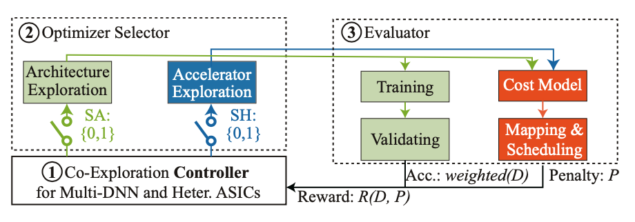 该框架首次实现了针对应用程序中具有多个 AI 任务,对每个任务搜索到特定的神经网络结构。进而通过对由多个子加速器连接而成的异构 ASIC 平台的设计进行搜索,完成神经网络结构到异构 ASIC 平台的部署,以及资源的分配。
