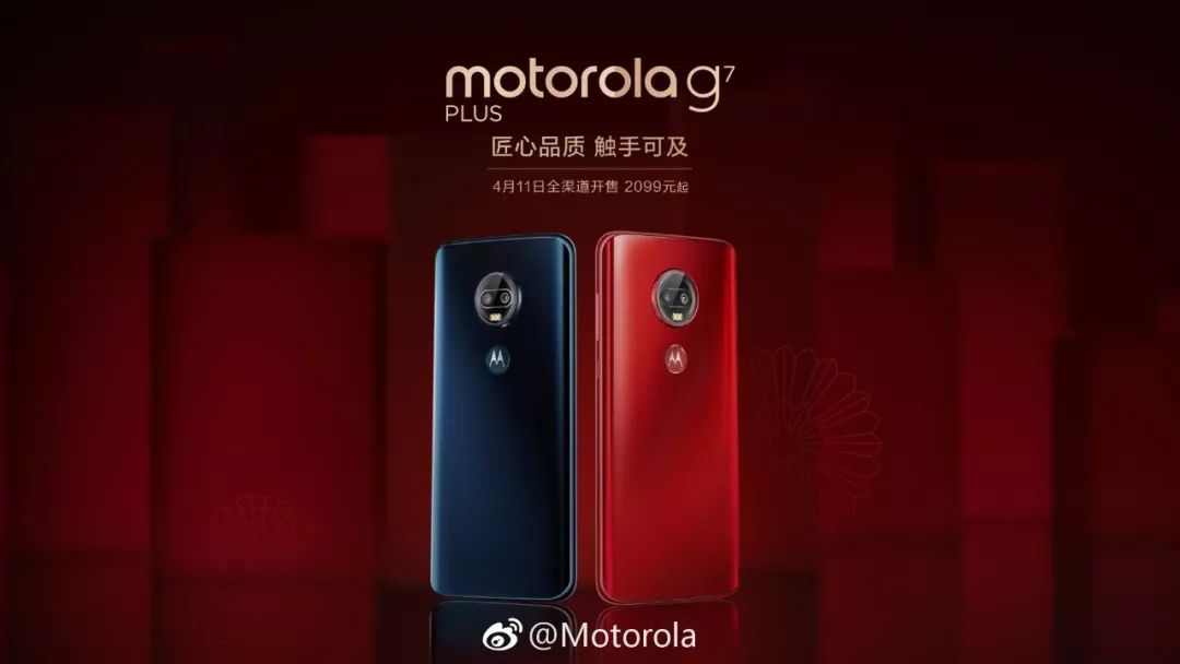 4 月 9 日,摩托罗拉正式发布国行版 g7 PLUS,指纹 logo 二合一设计,骁龙 636 处理器,6.24 英寸水滴屏,后置 1600+500 万双摄,前置 1200 万,3000mAh 电池,亮点是支持 Type C 接口 27W QC4.0 快充,保留 3.5mm 耳机接口,4+128 版本 2199 元,6+128 版本 2399 元,中国红和深海蓝两个配色。
