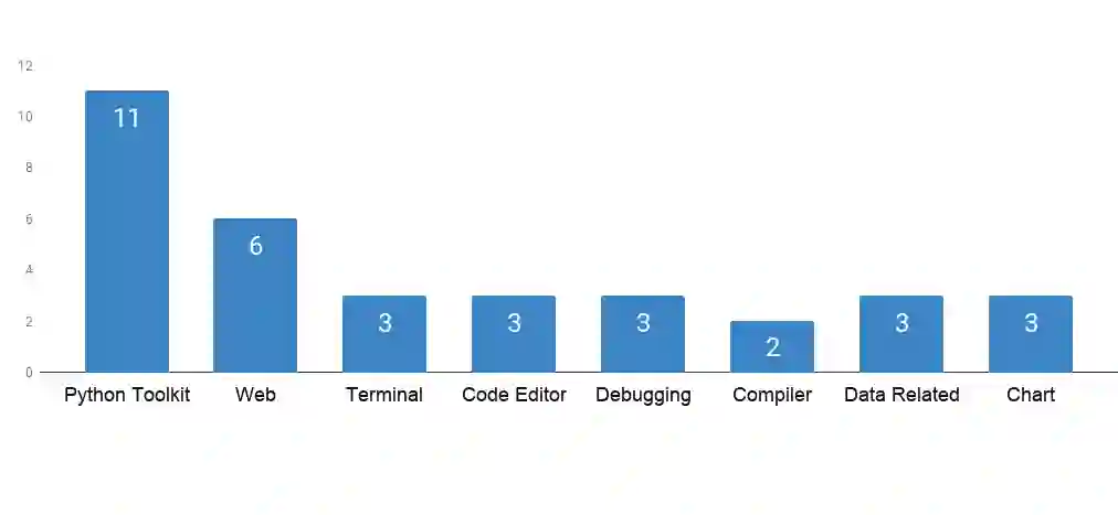 下面是从2018年中近10000个python开源框架中评价整理的34个最为好用的开源框架,它们细分可以分为Python Toolkit、Web、Terminal、Code Editor、Debugging、complier、Data Related、Chart8类,分布情况如下图: