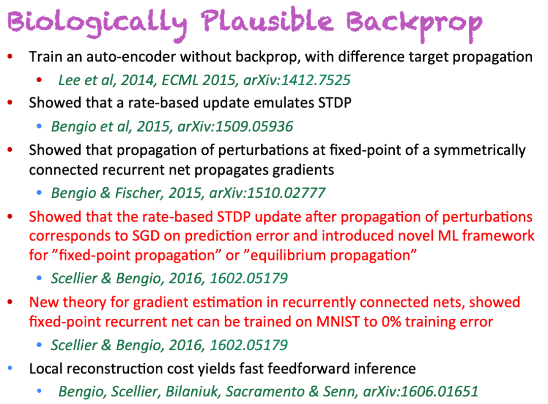 次年,在 NIPS 2016 Workshop 上,Yoshua Bengio 做了同名演讲,其中就探讨了「反向传播」机制的生物学可信性。