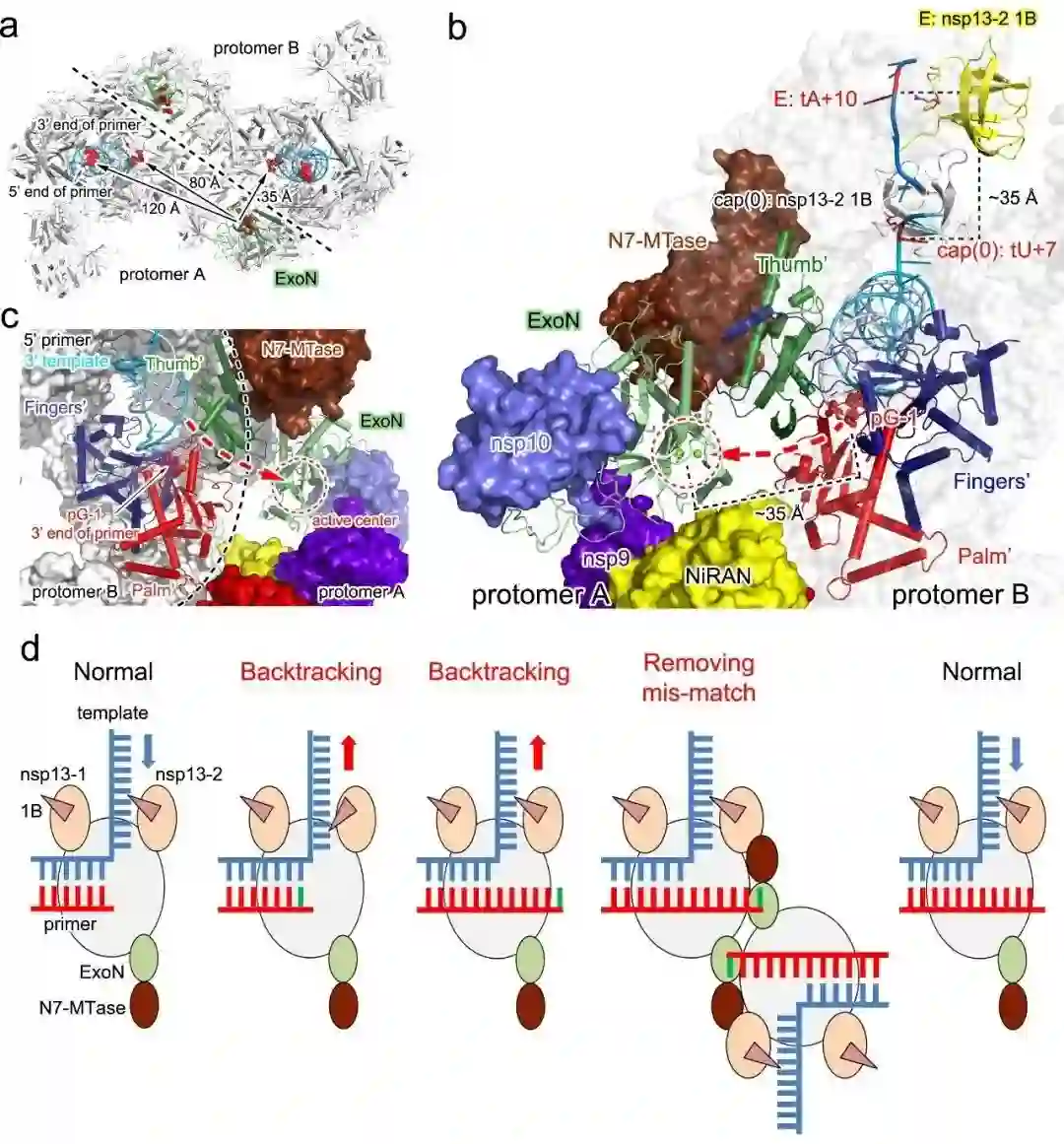 揭示了新冠病毒转录复制机器的完整组成形式;发现病毒聚合酶的核苷转移酶结构域是催化mRNA「加帽」成熟的关键酶,明确了帽结构的合成过程,为发展新型、安全的广谱抗病毒药物提供了全新靶点;发现病毒以「反式回溯」的方式对错配碱基和抗病毒药物进行「剔除」,阐明了瑞德西韦等药物效果不良的分子机制,为优化针对聚合酶的抗病毒药物提供了关键科学依据。