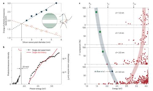 a,根据 Gregorkiewicz 研究组的实验数据,硅量子点间接带隙基态 PL 带和高能直接带隙 PL 带随量子点直径大小改变的变化。b,对于直径3纳米硅量子点,我们在温度为 70K 测得的单量子发光谱和吸收谱与理论计算结果的比较。c,Gregorkiewicz 研究组的实验数据指出随量子点减小直接带隙在能量上迅速红移(光谱上的红移是指光子能量变小,光子波长变长),而我们的理论结果指出随硅量子点变小,直接带隙没有发生显著红移,而是有一点蓝移。