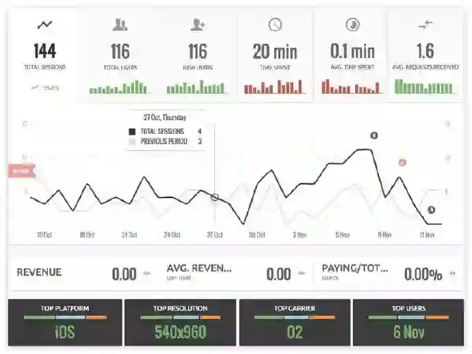 Flurry Analytics为企业提供分析,可以跨多个移动应用程序来监视的用户行为。你可以从多个应用程序中查看数据,以获得一个整体的性能视图,并很容易地比较你的iOS和Android版本。