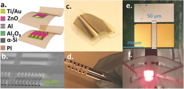 作为一个替代方案,Hussain 团队设计出一种非平面的垂直半导体鳍状结构。这种结构侧向互联形成波纹状的晶体管阵列。研究人员选择氧化锌作为激活的沟道材料,并在硅基材上生成波纹状架构,然后使用低温工艺将它转移到柔软的聚合物载体上。
